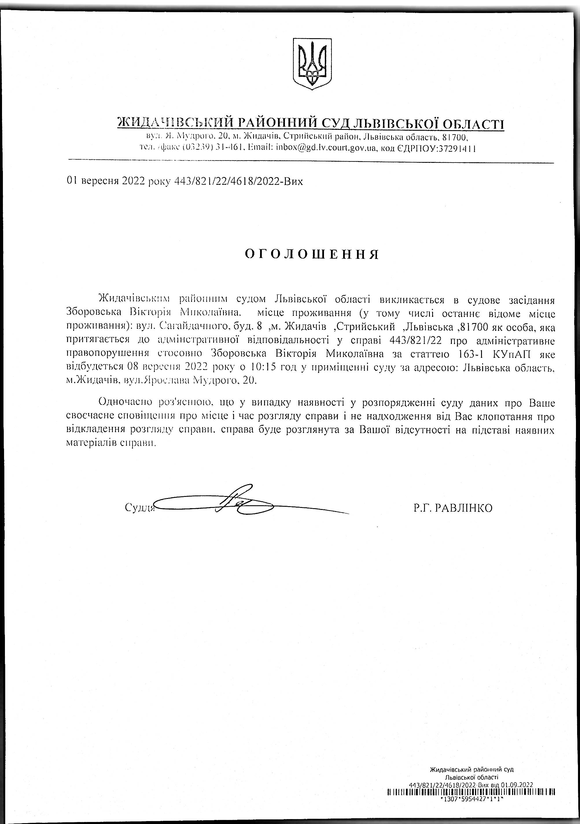Оголошення про виклик до суду Зборовської В.М.