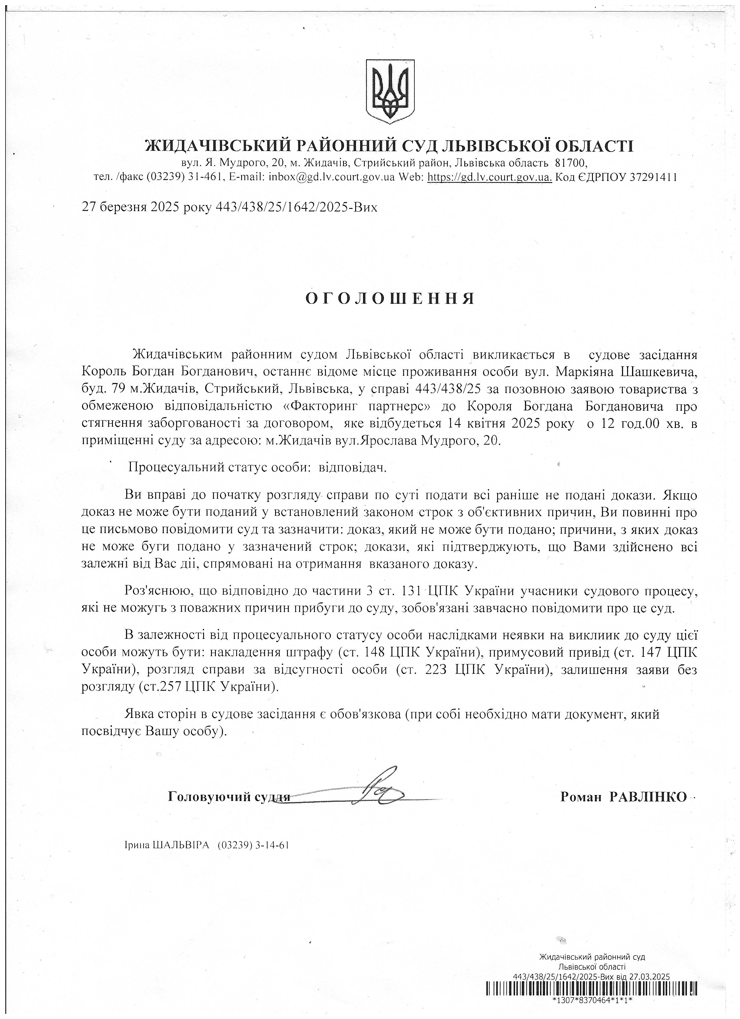 Оголошення про виклик до суду Король Б.Б.