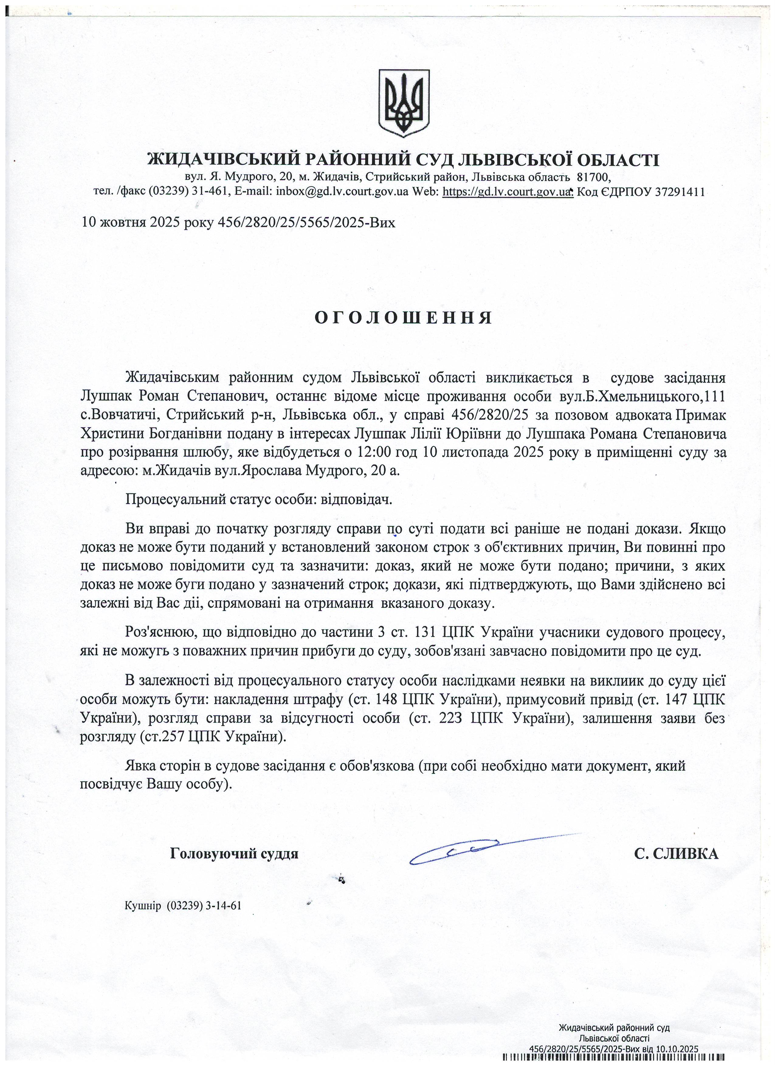Оголошення про виклик до суду Лушпак Р.С.
