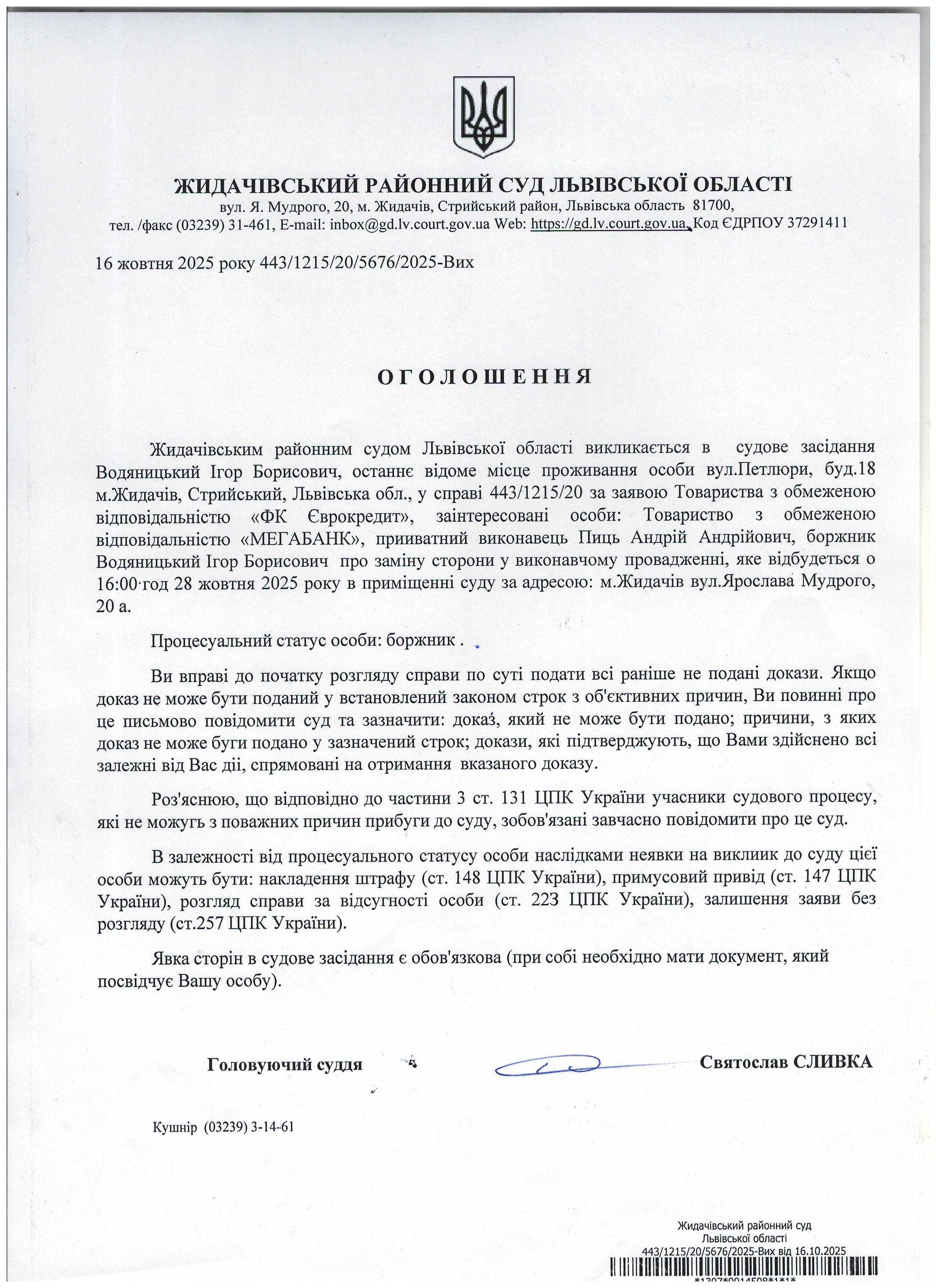 Оголошення про виклик до суду Водяницький І.Б.