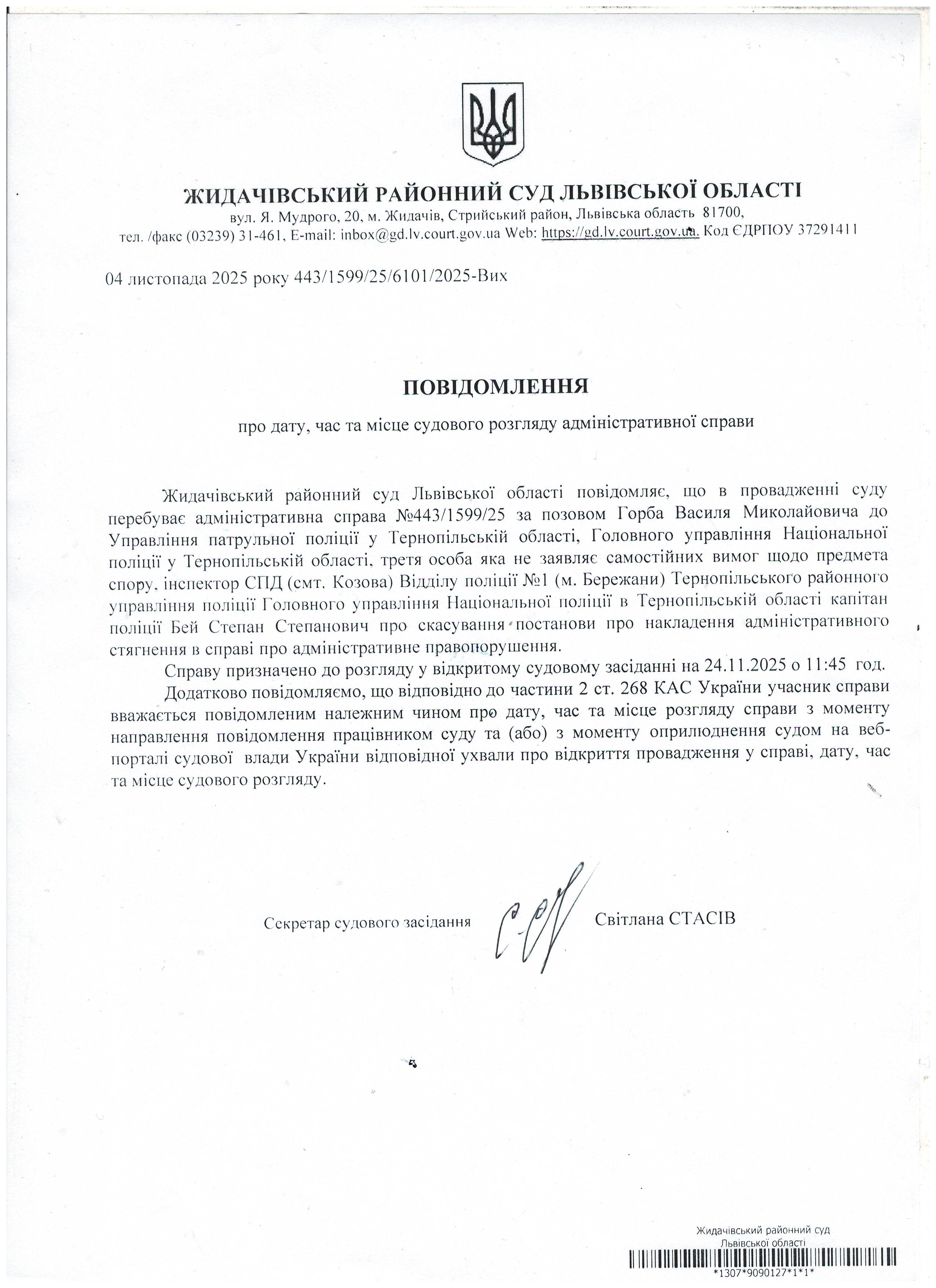 Повідомлення про дату, час та місце судового розгляду адміністративної справи