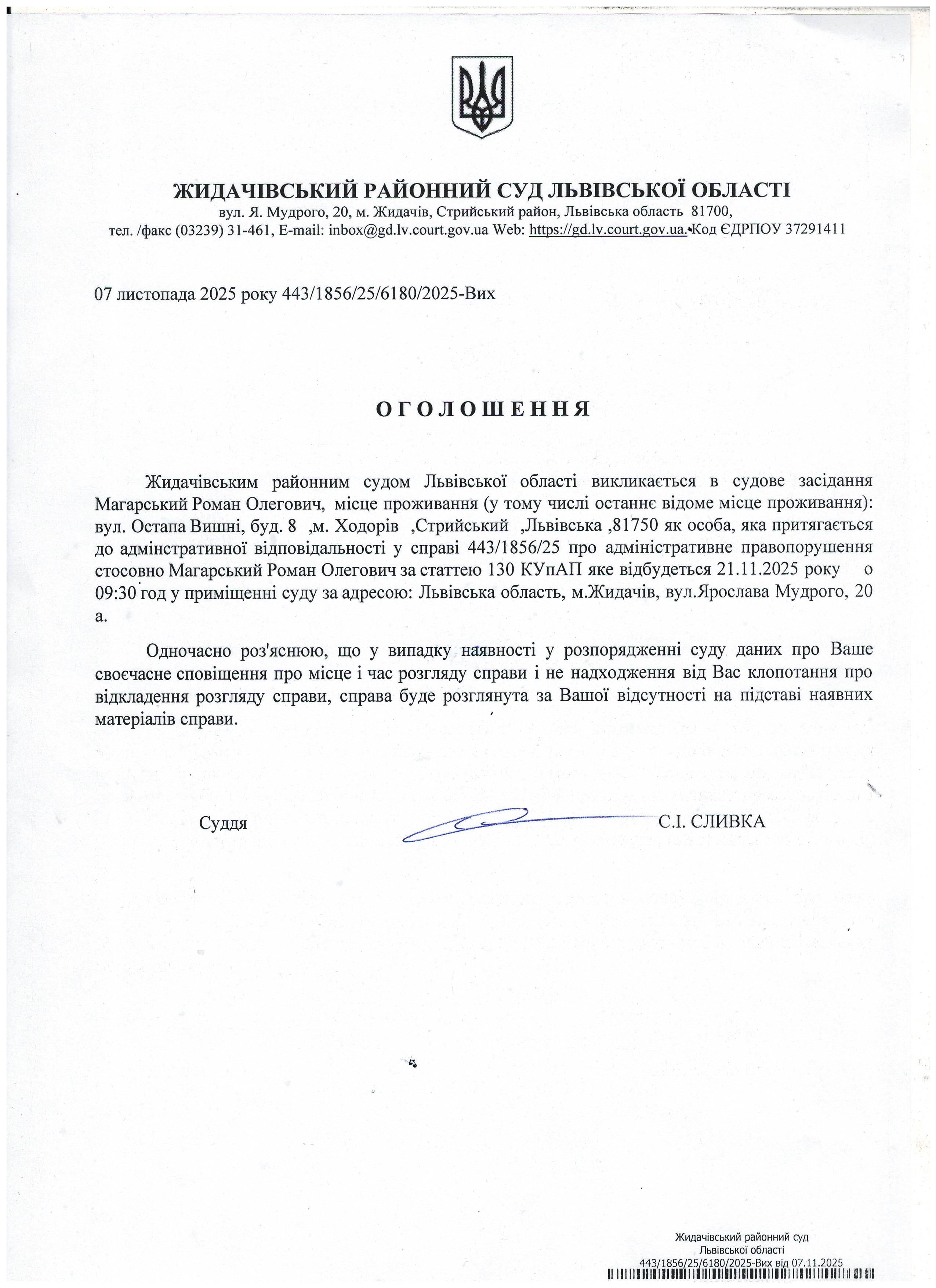 Оголошення про виклик до суду Магарський Р.О.