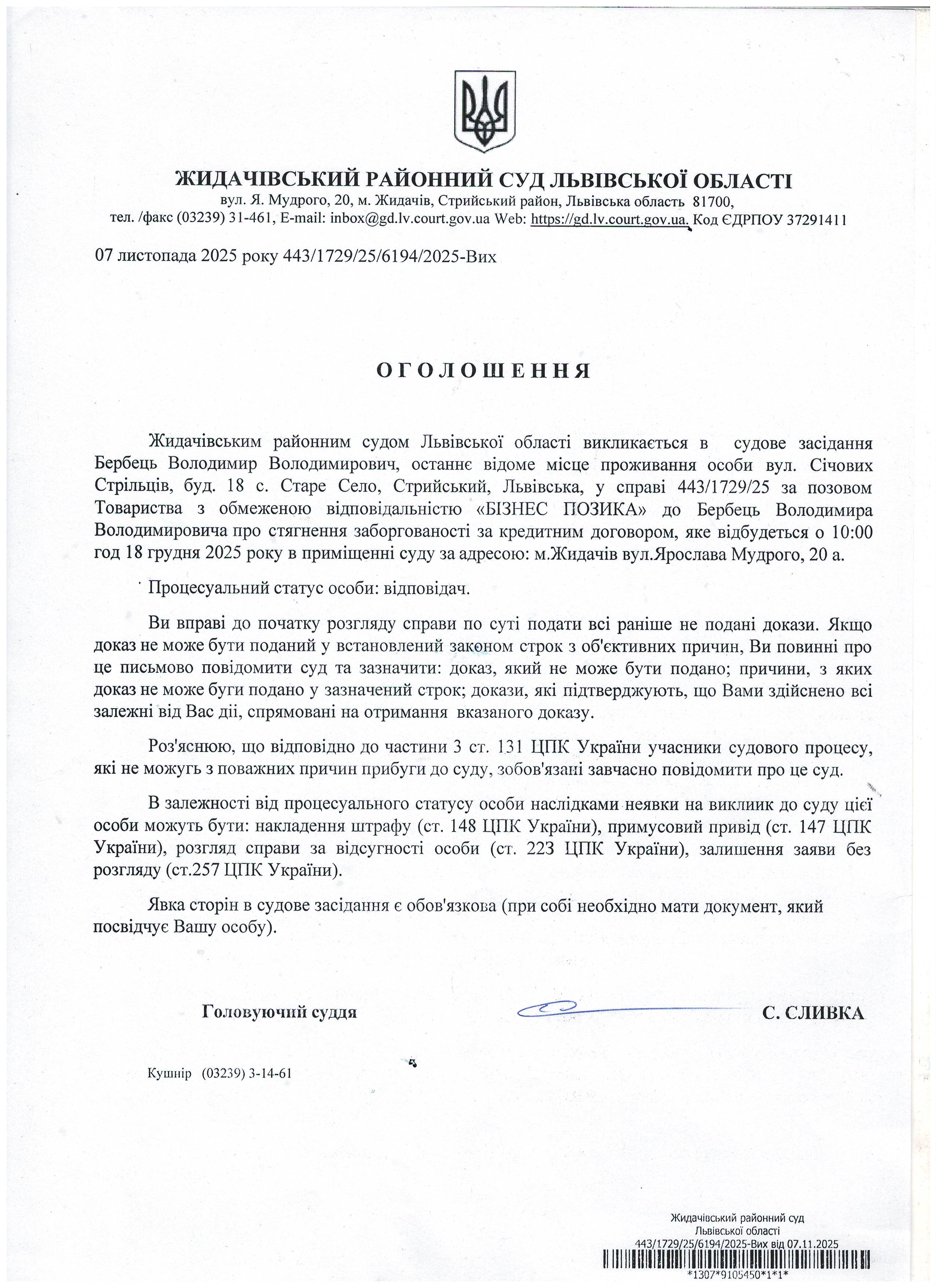 Оголошення про виклик до суду Бербець В.В.