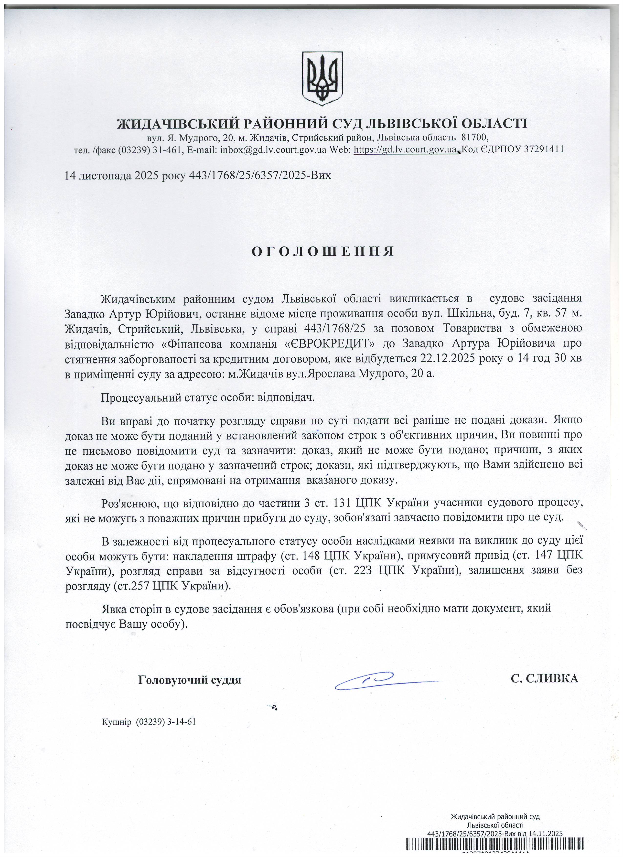Оголошення про виклик до суду Завадко А.Ю.