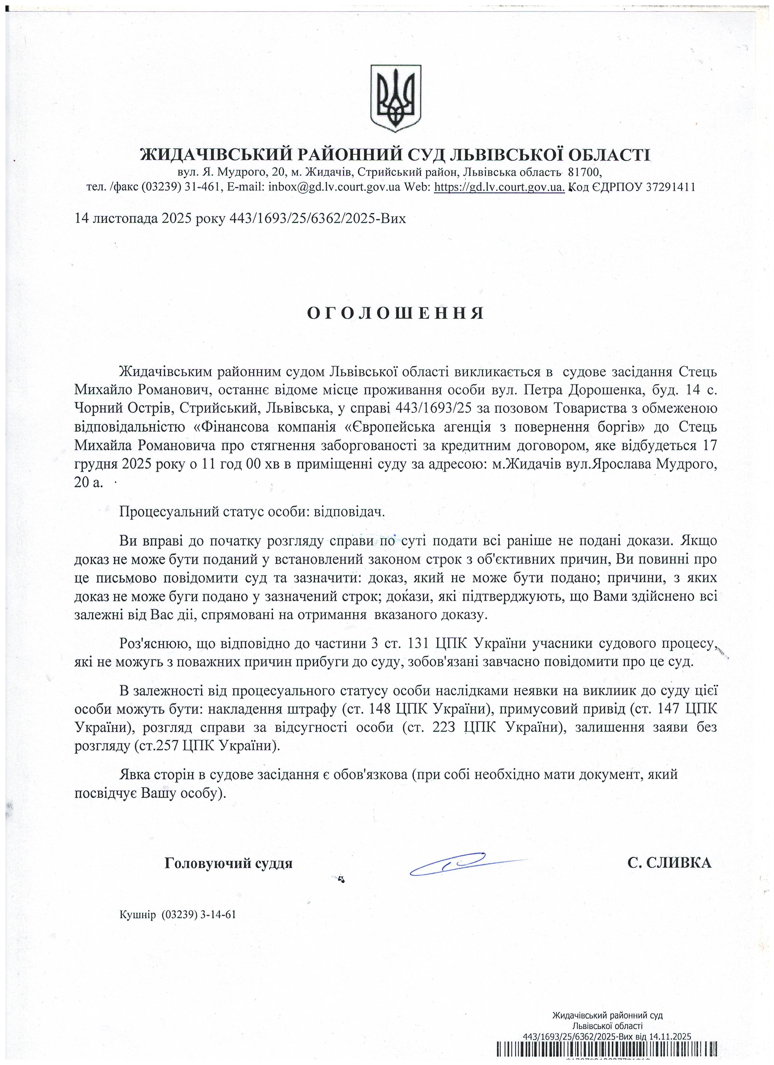 Оголошення про виклик до суду Стець М.Р.