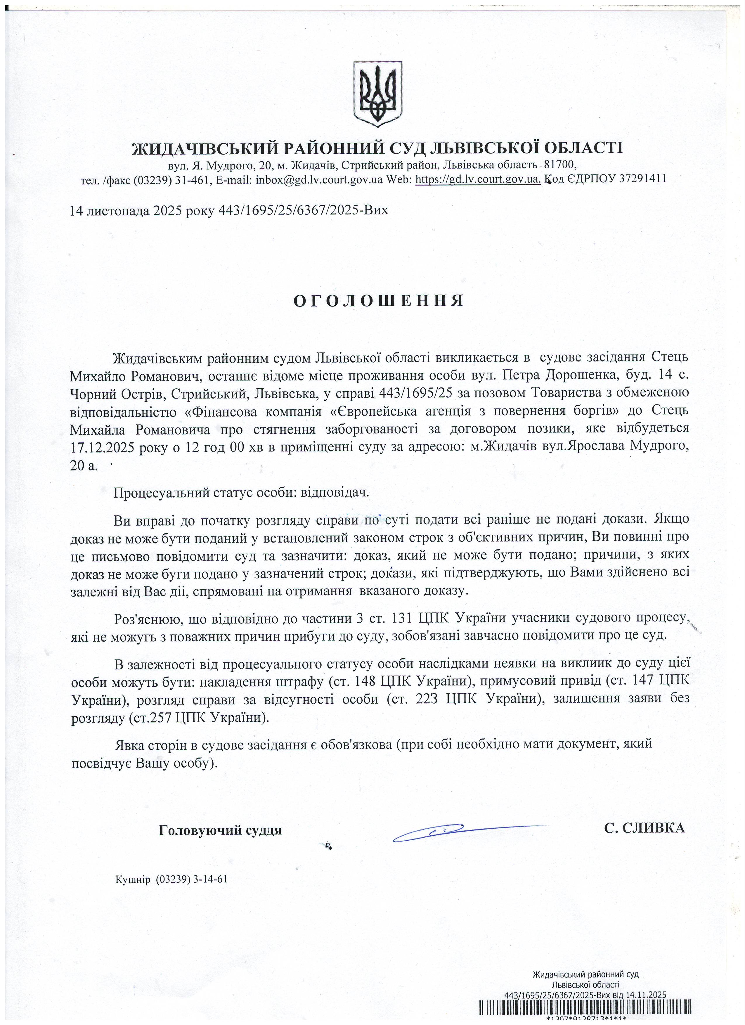 Оголошення про виклик до суду Стець М.Р.