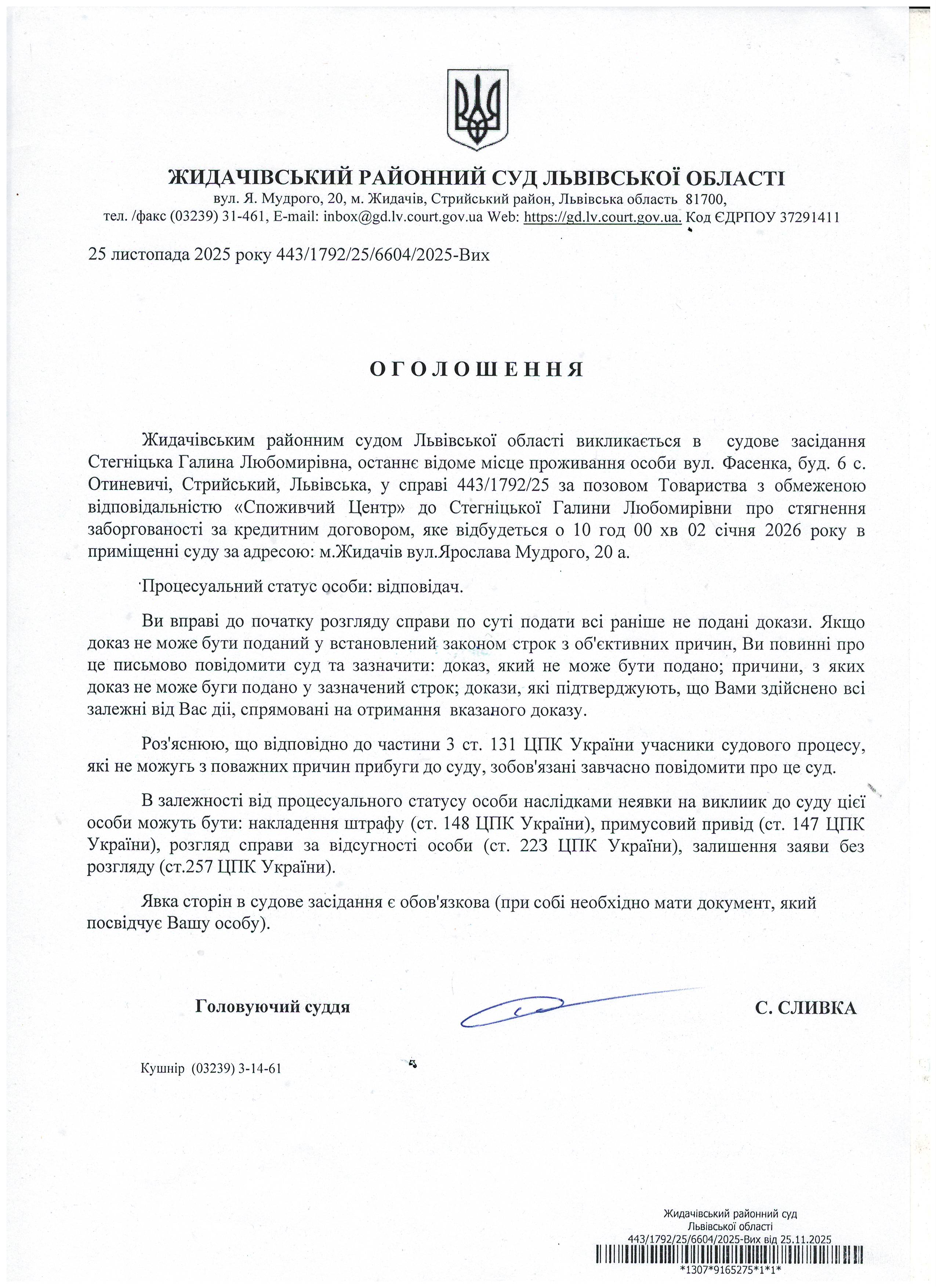 Оголошення про виклик до суду Стегніцька Г.Л.