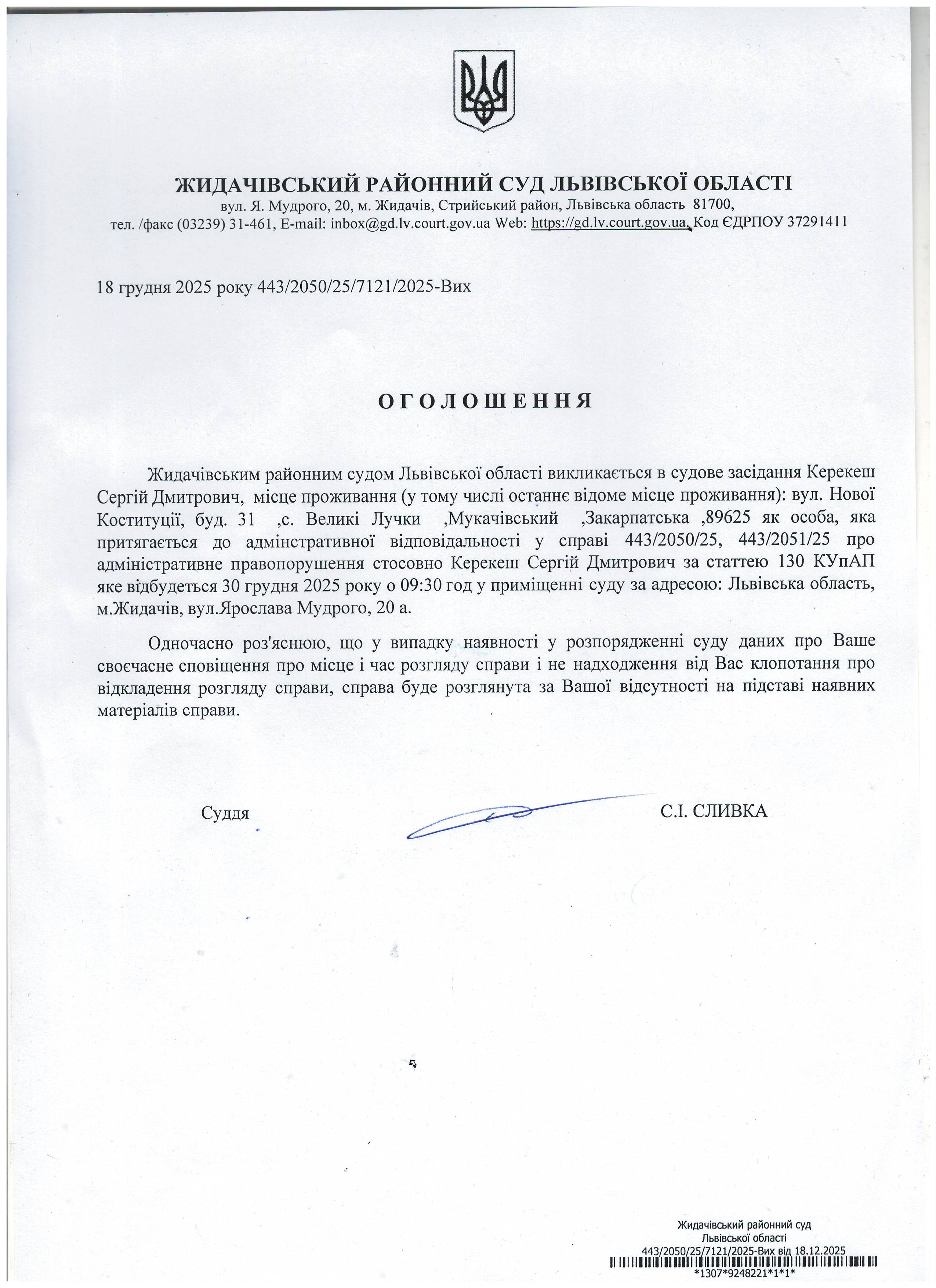 Оголошення про виклик до суду Керекеш С.Д.
