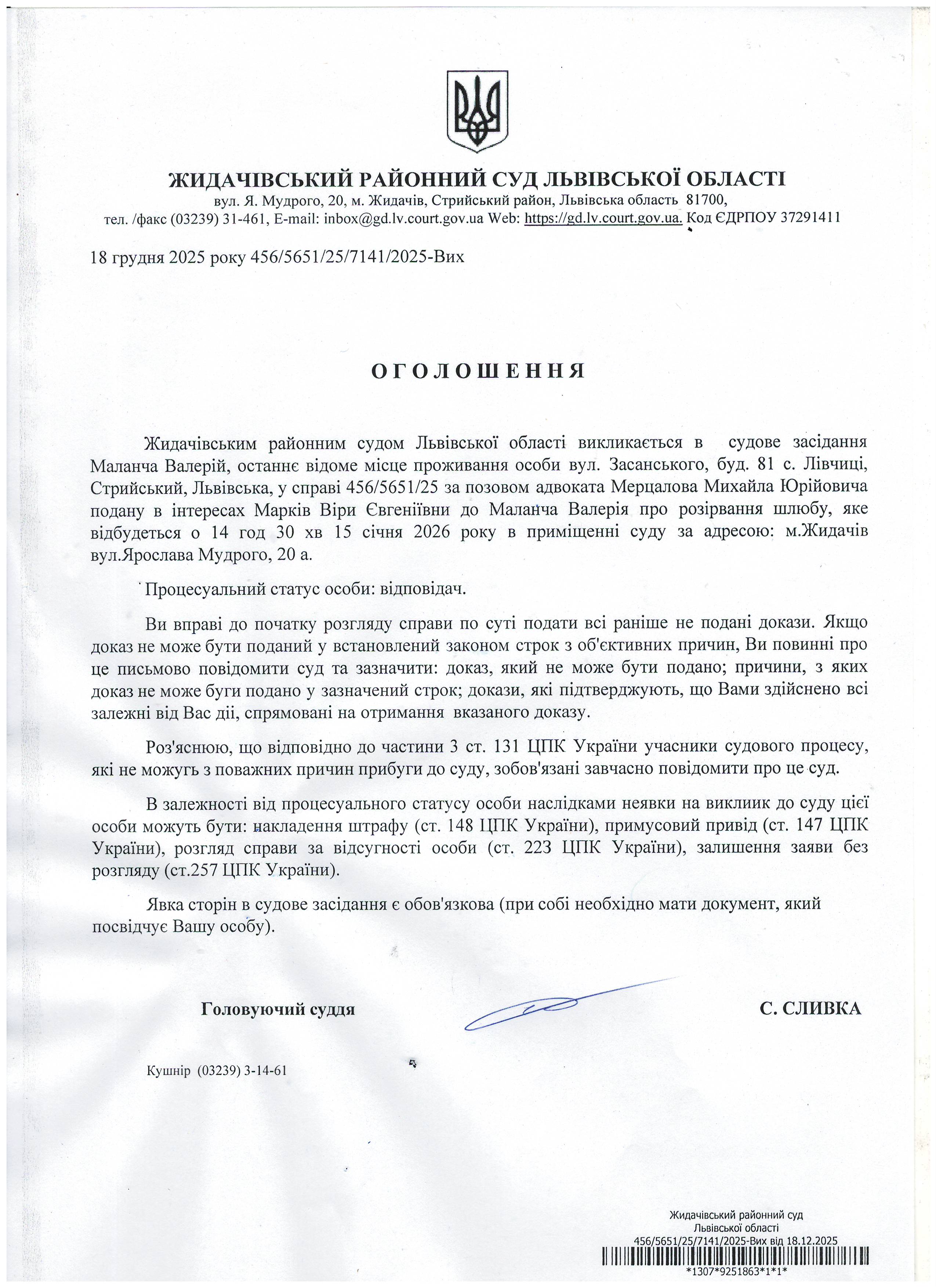 Оголошення про виклик до суду Маланча В.