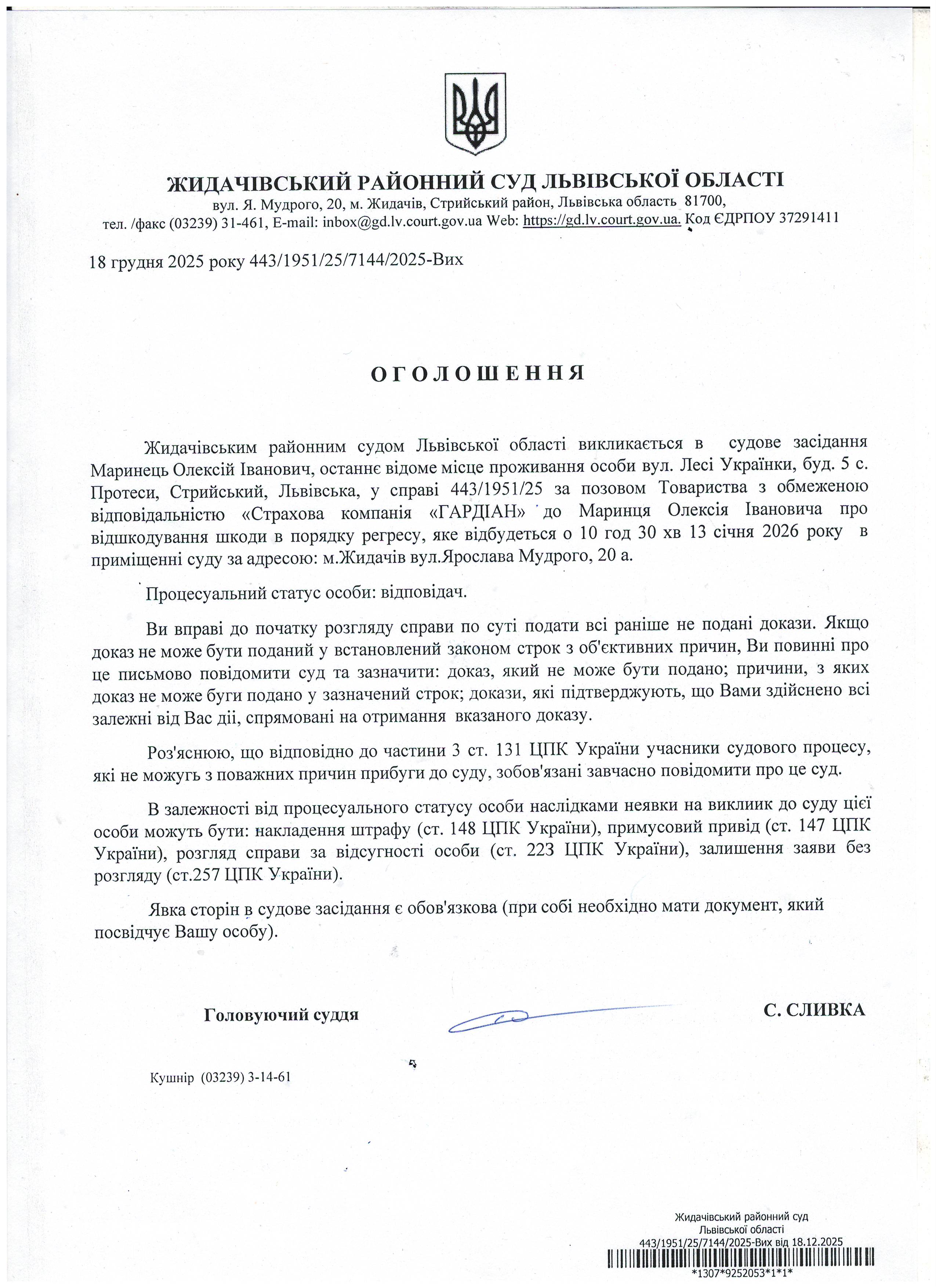 Оголошення про виклик до суду Маринець О.І.