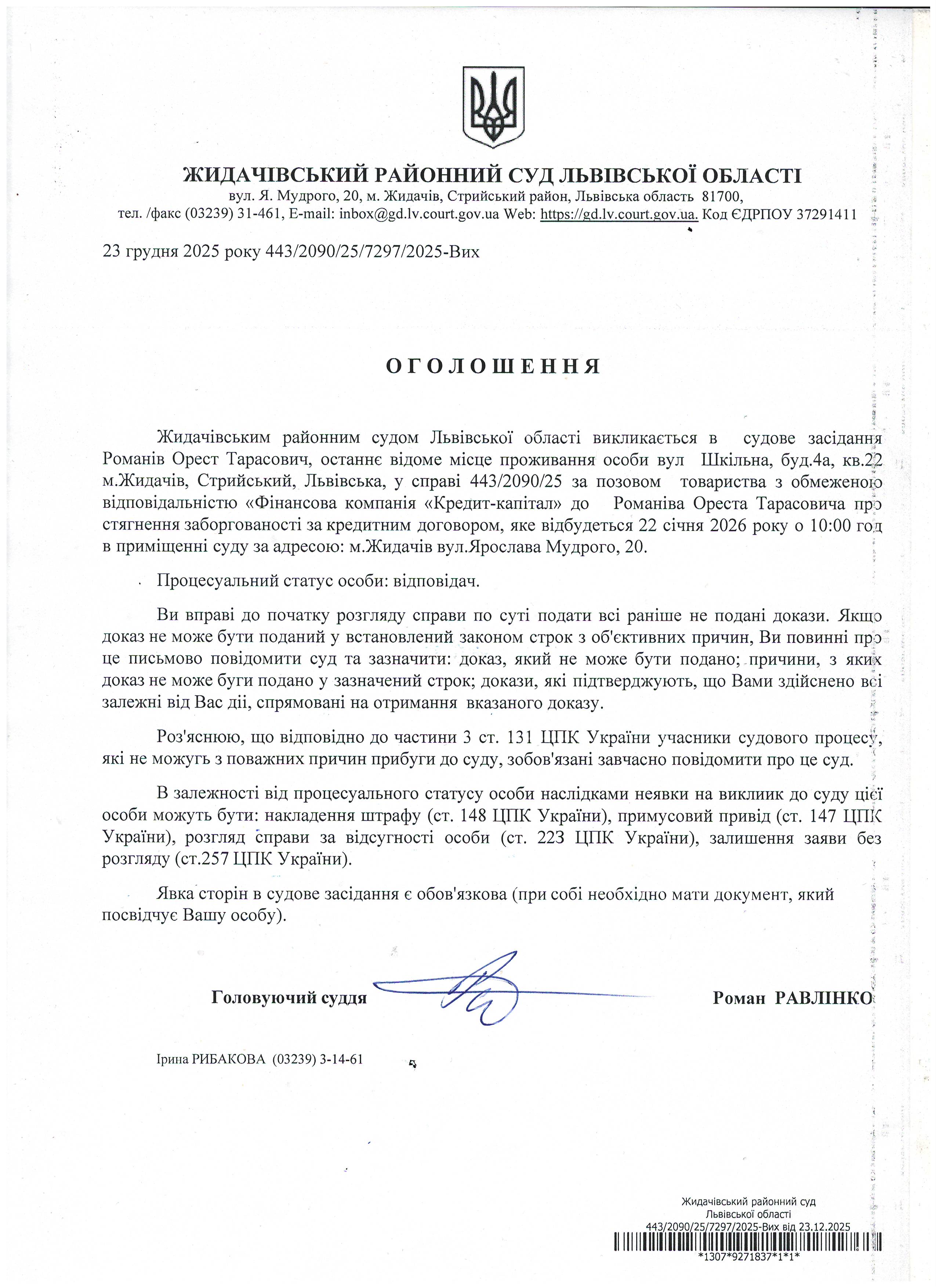 Оголошення про виклик до суду Романів О.Т.