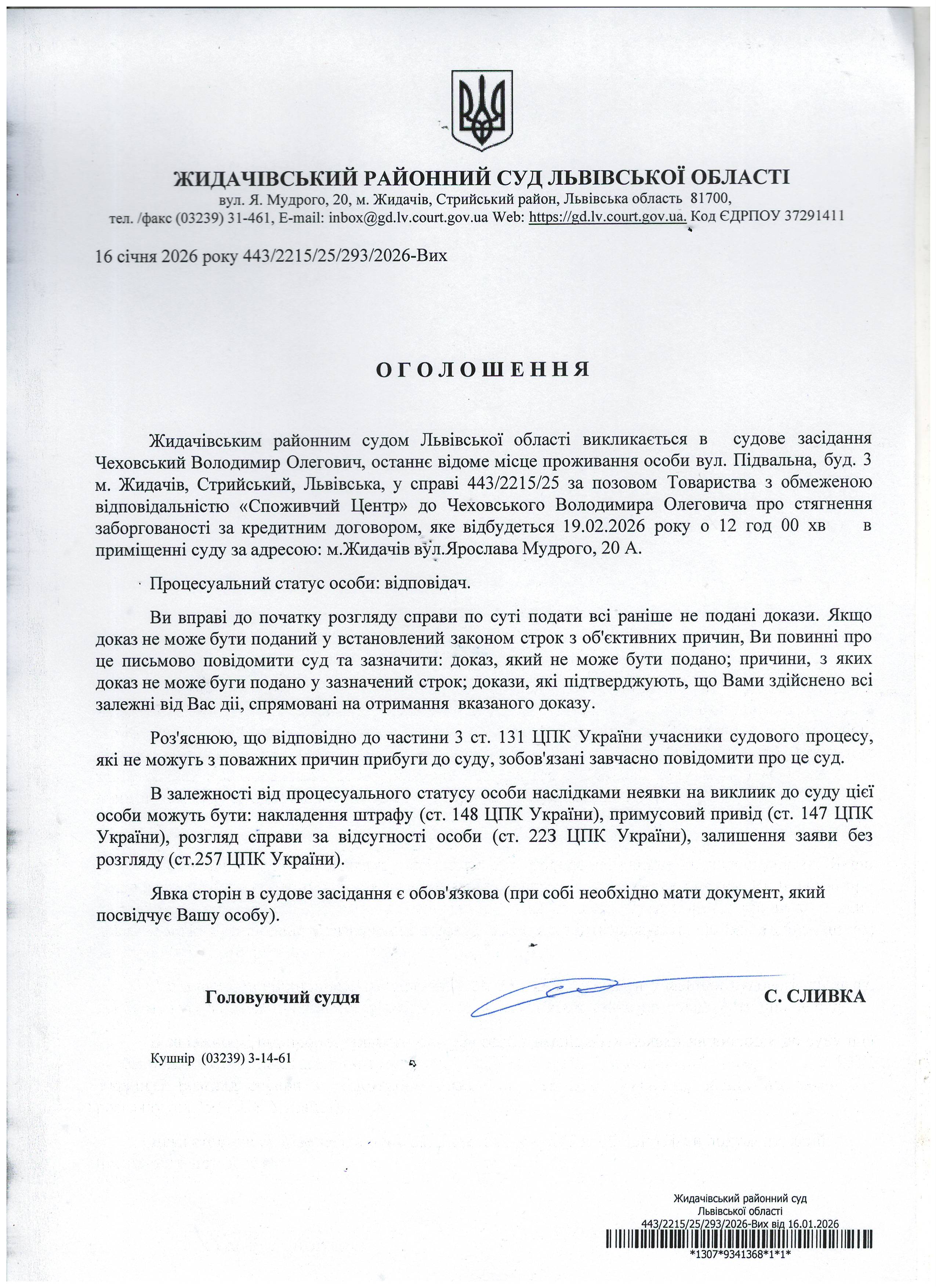 Оголошення про виклик до суду Чеховський В.О.