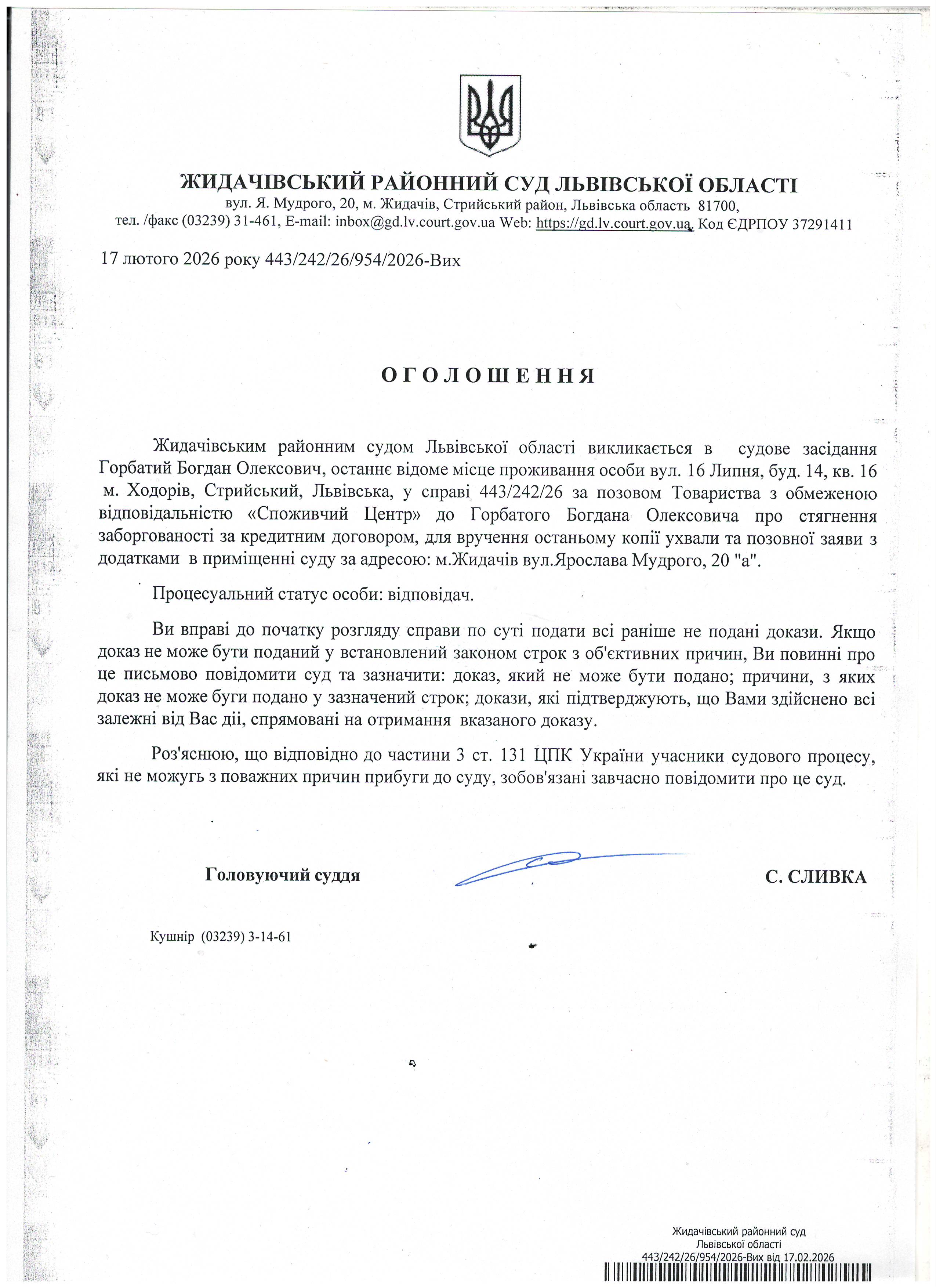 Оголошення про виклик до суду Горбатий Б.О.