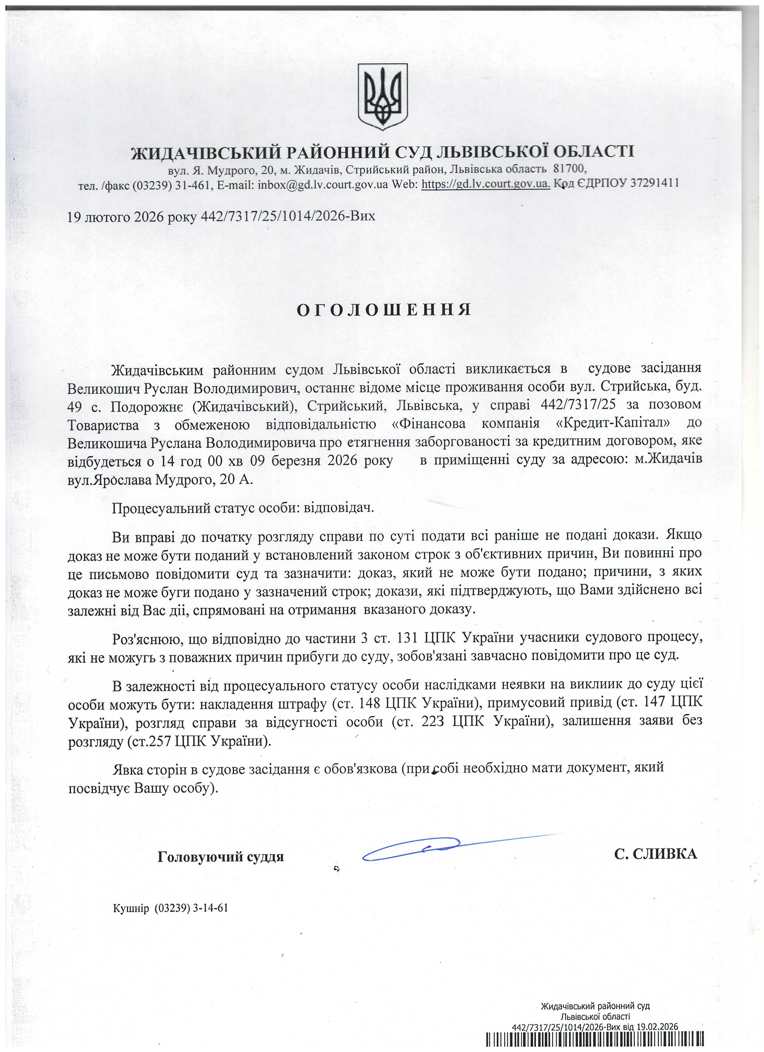 Оголошення про виклик до суду Великошич Р.В.
