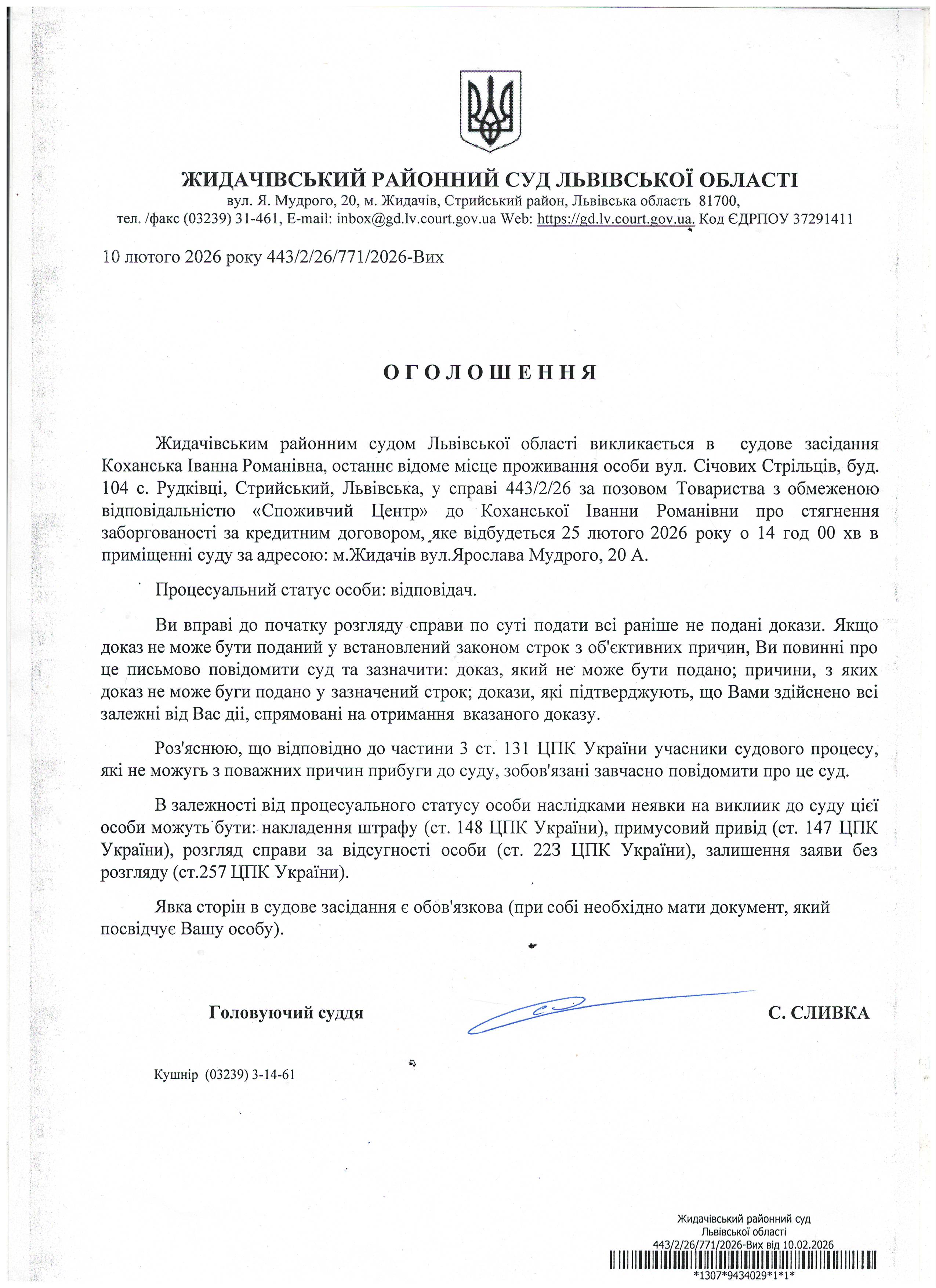Оголошення про виклик до суду Коханська І.Р.