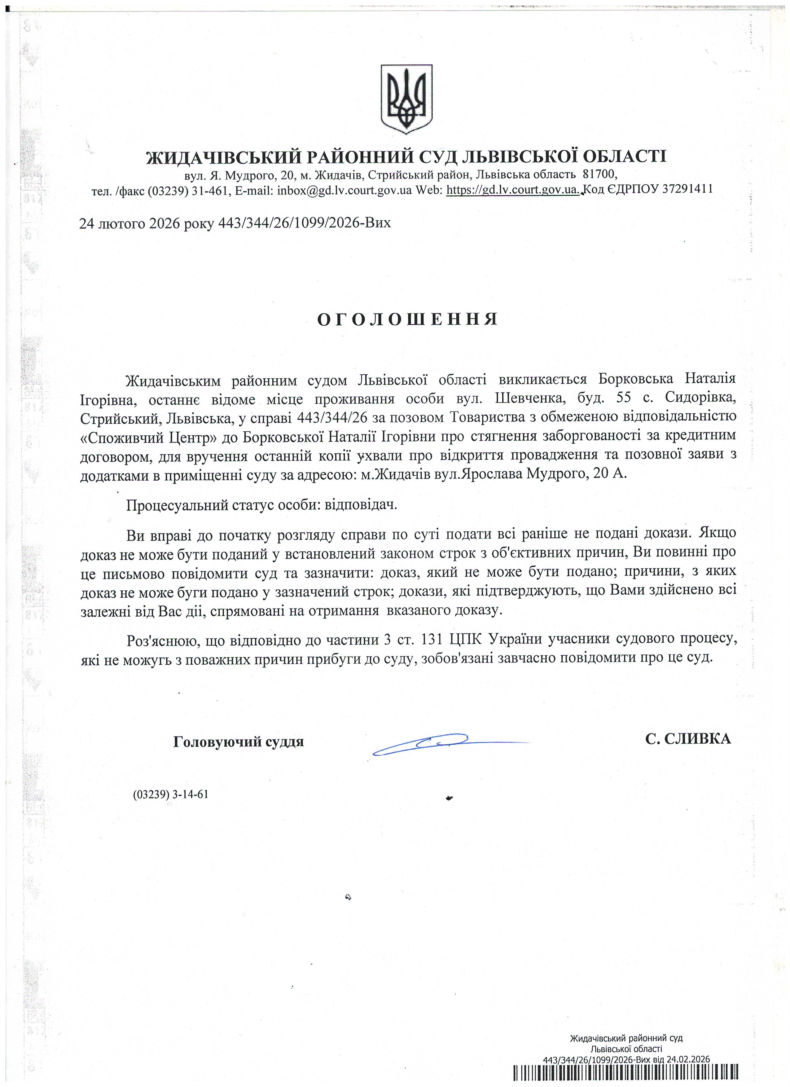Оголошення про виклик до суду Борковська Н.І.