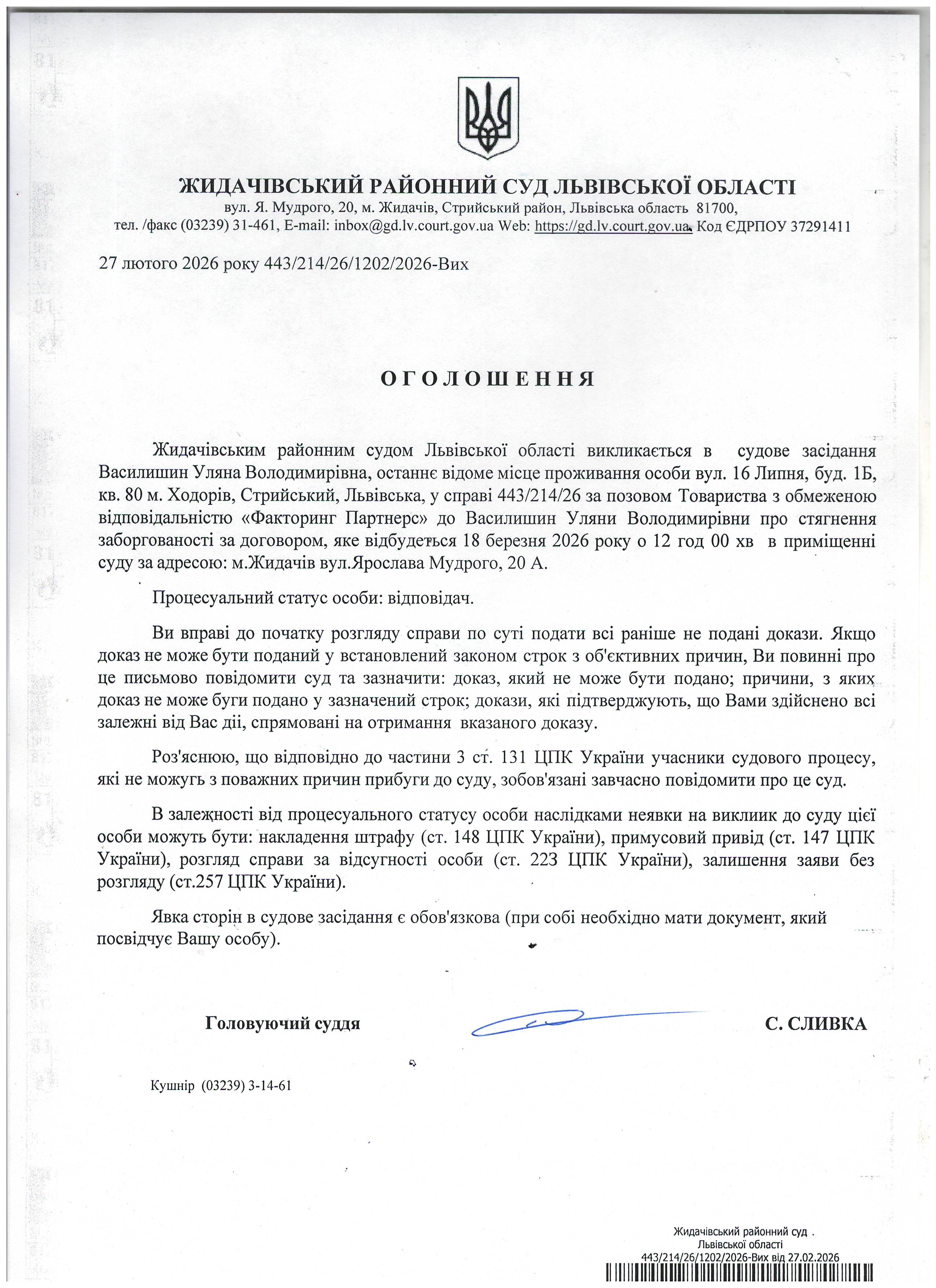 Оголошення про виклик до суду Василишин У.В.