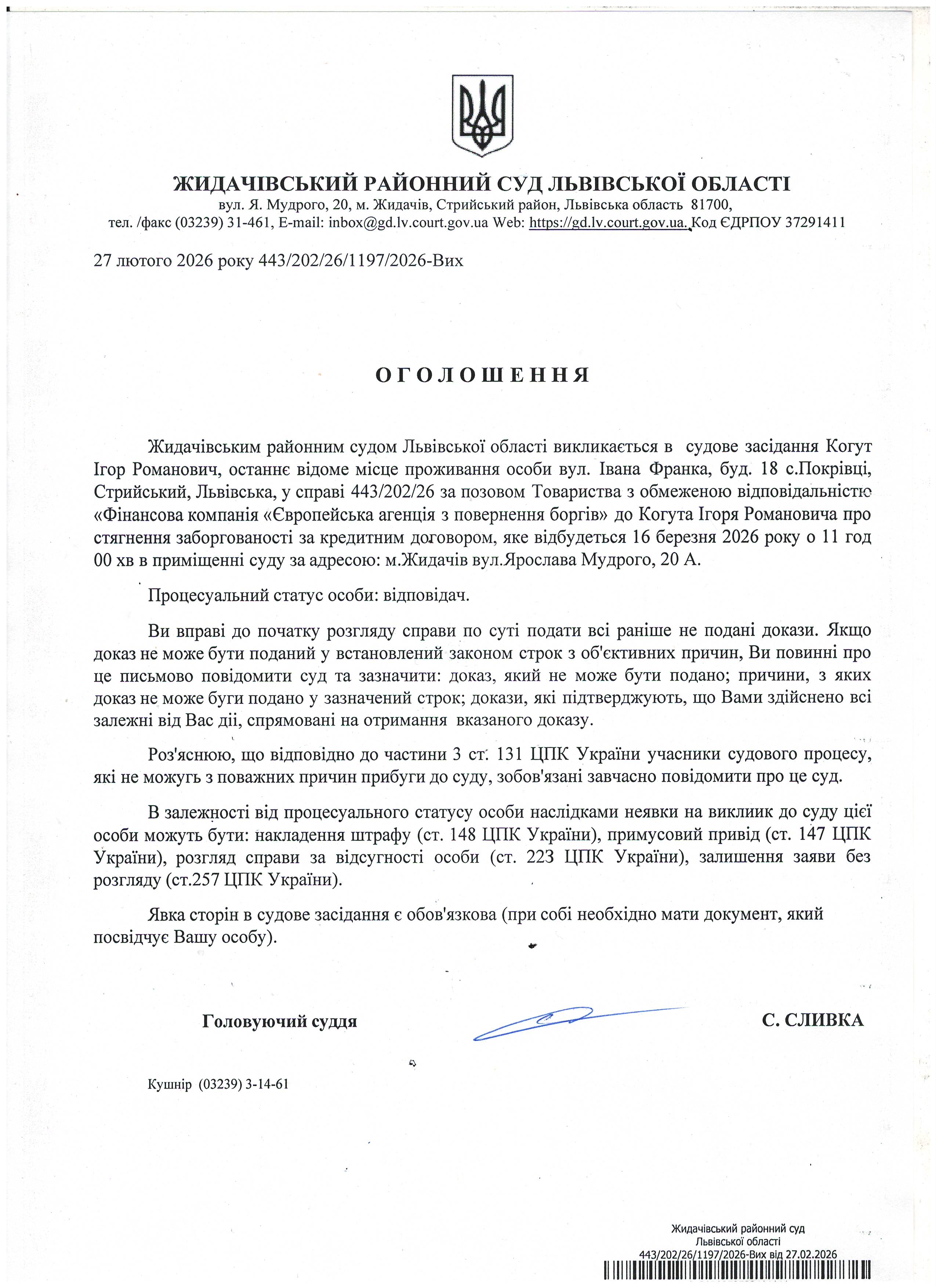 Оголошення про виклик до суду Когут І.Р.