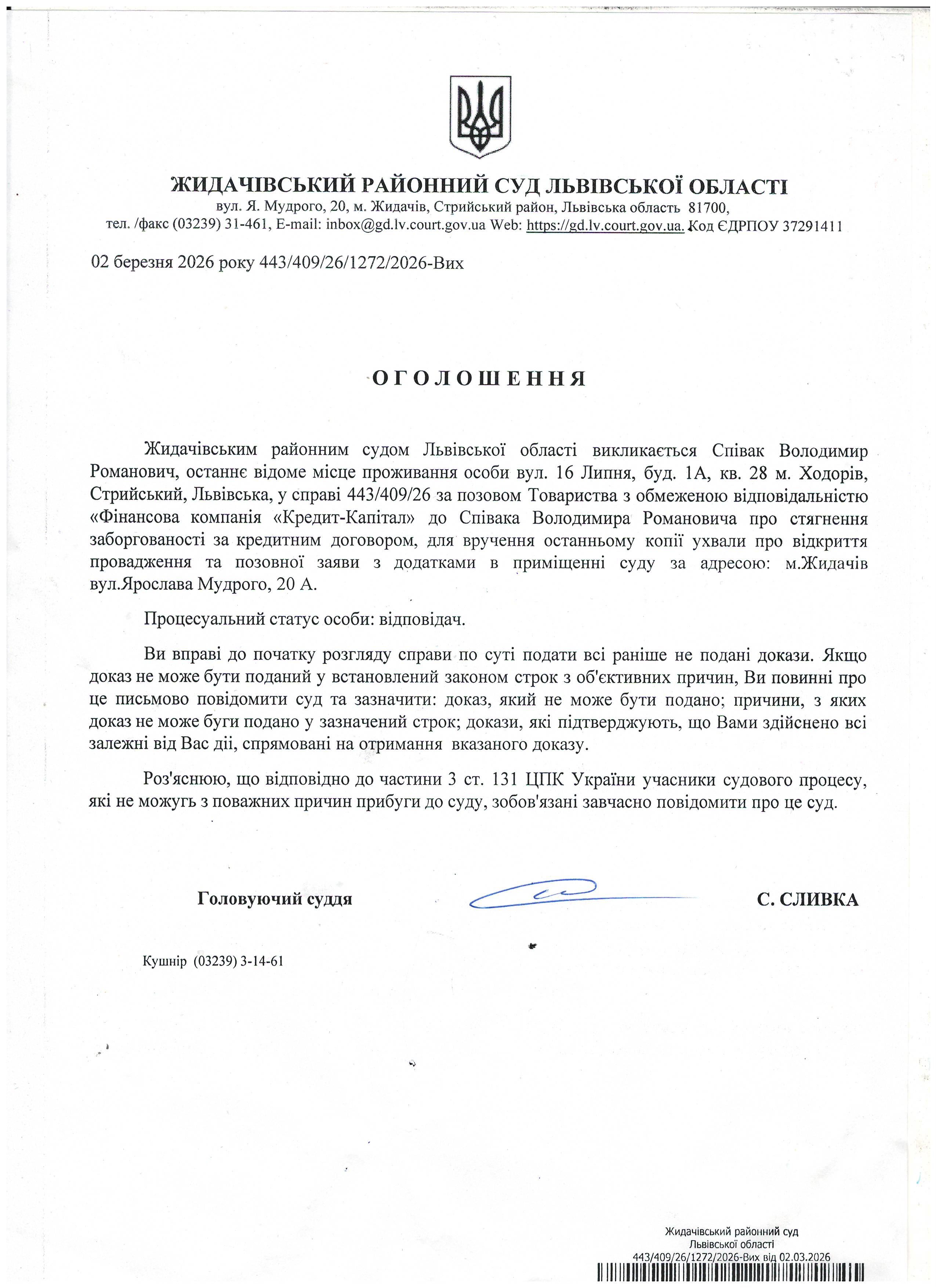 Оголошення про виклик до суду Співак В.Р.