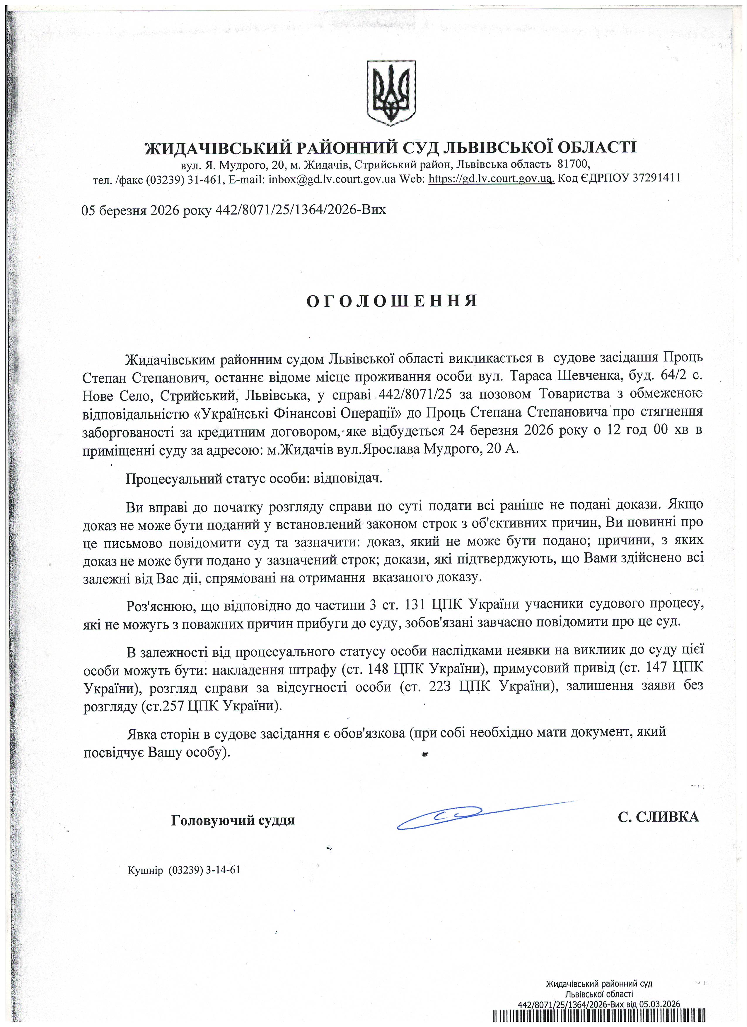 Оголошення про виклик до суду Проць С.С.