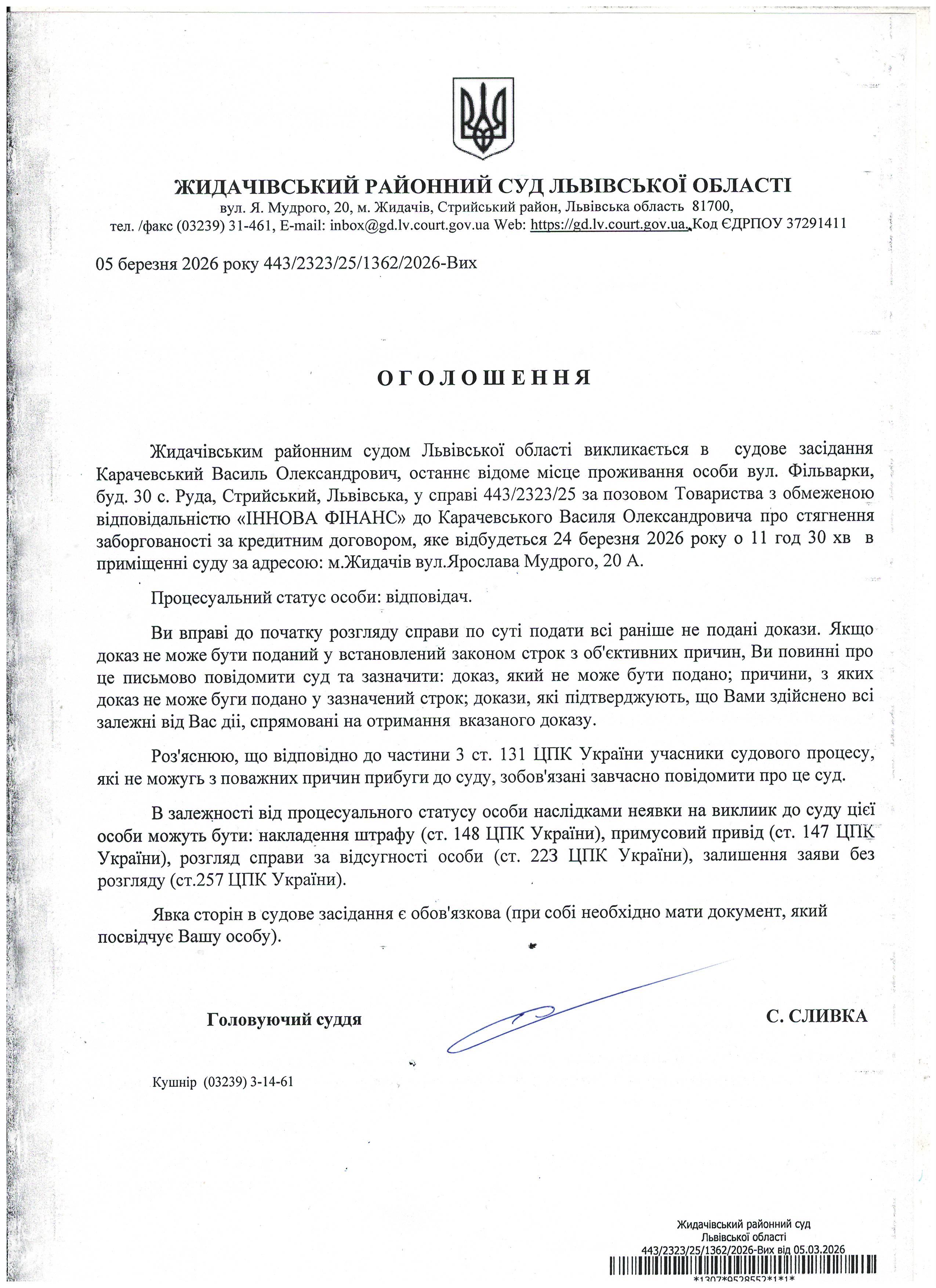 Оголошення про виклик до суду Карачевський В.О.