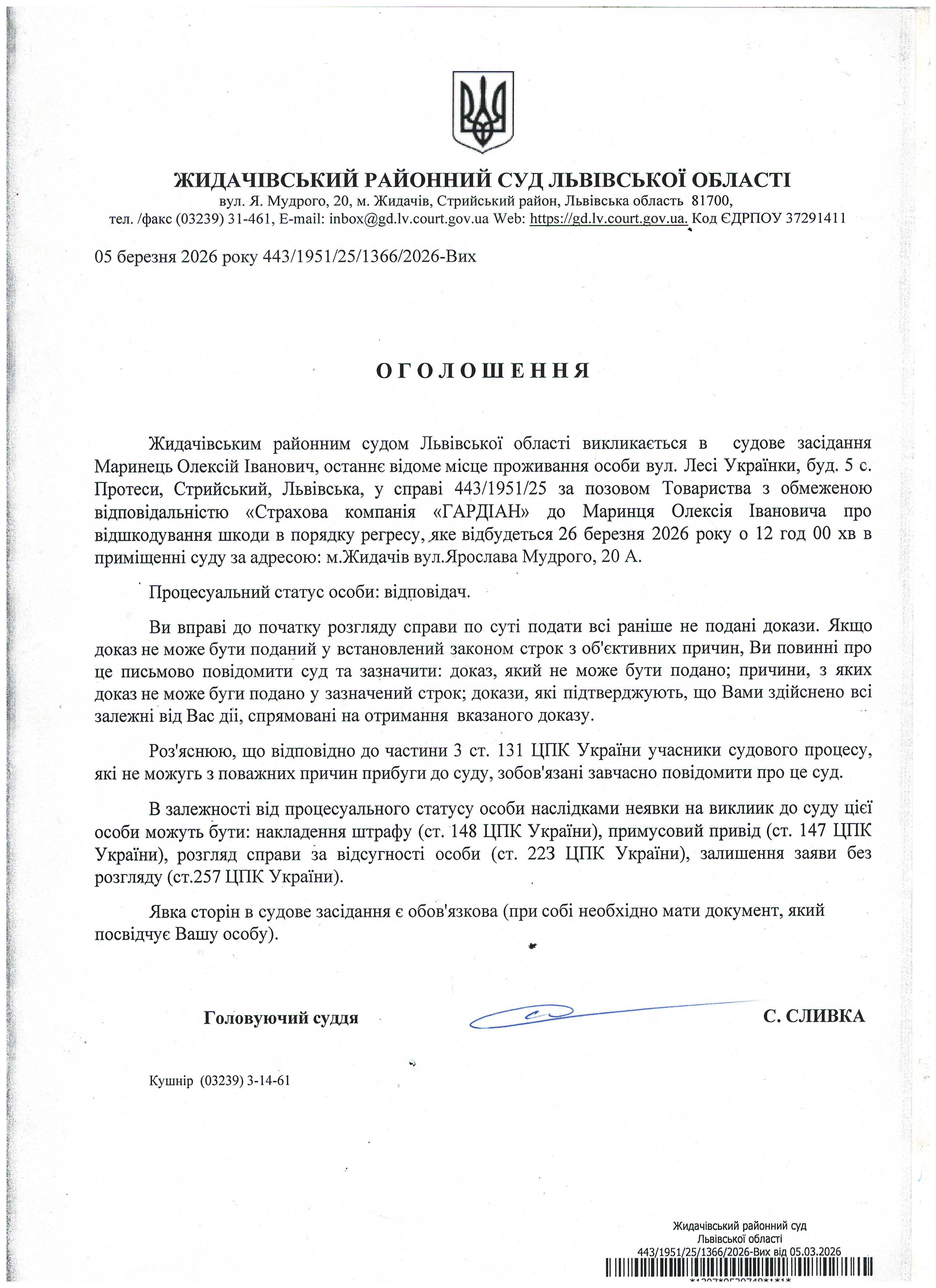 Оголошення про виклик до суду Маринець О.І.