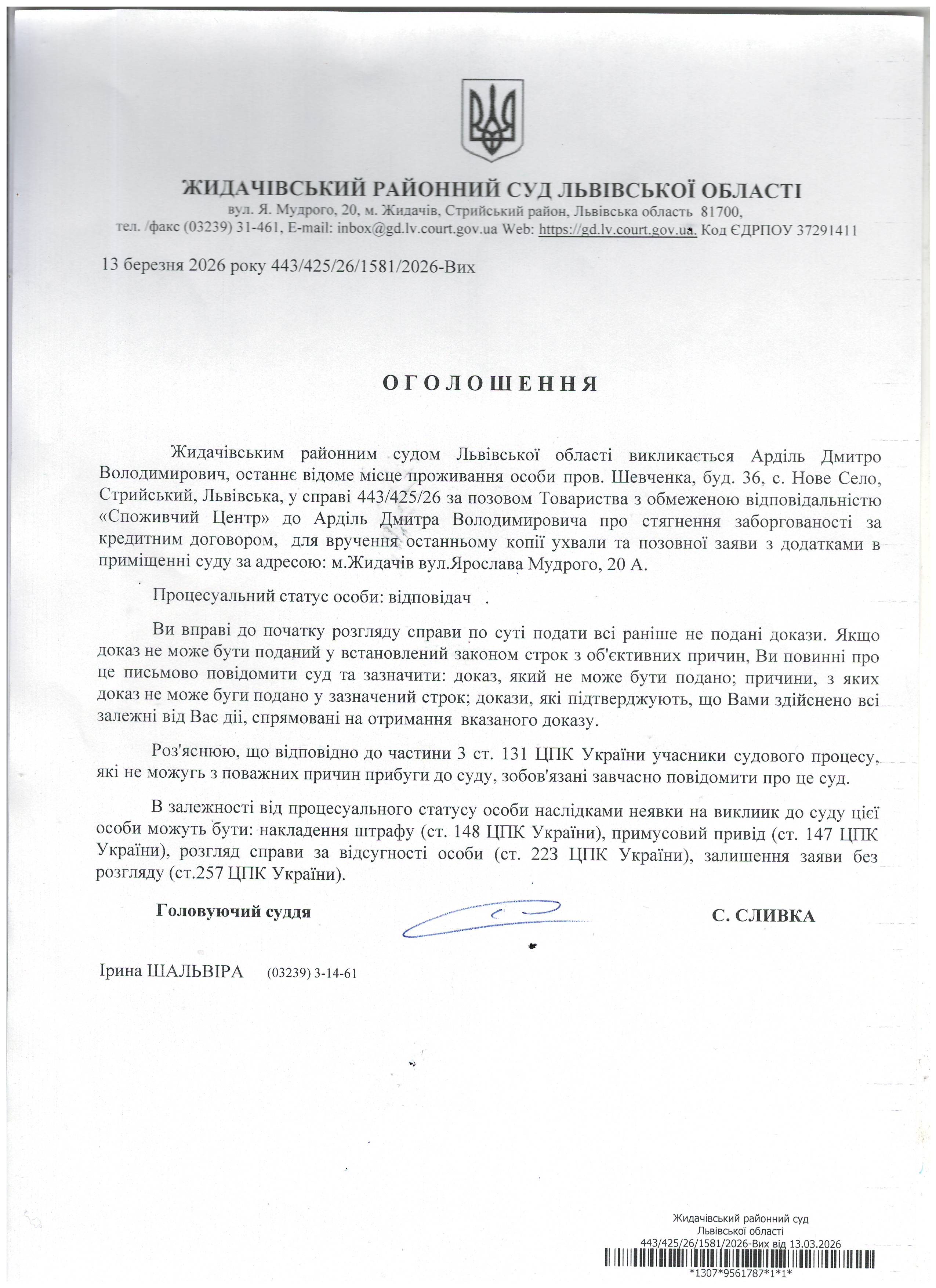 Оголошення про виклик до суду Арділь Д.В.