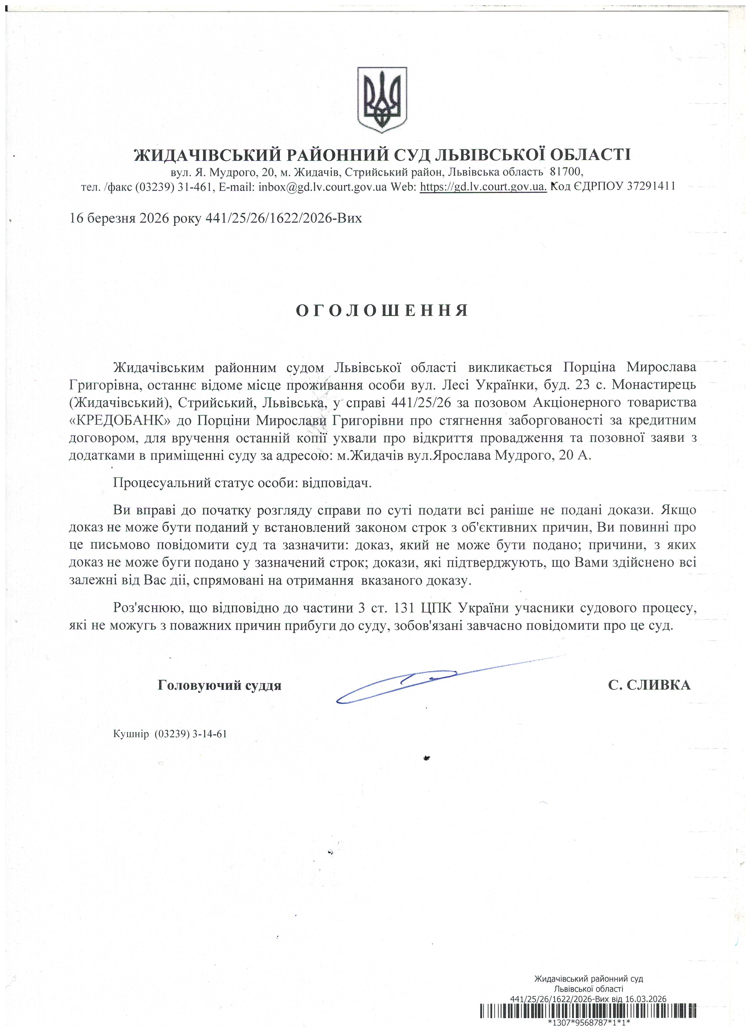 Оголошення про виклик до суду Порціна М.Г