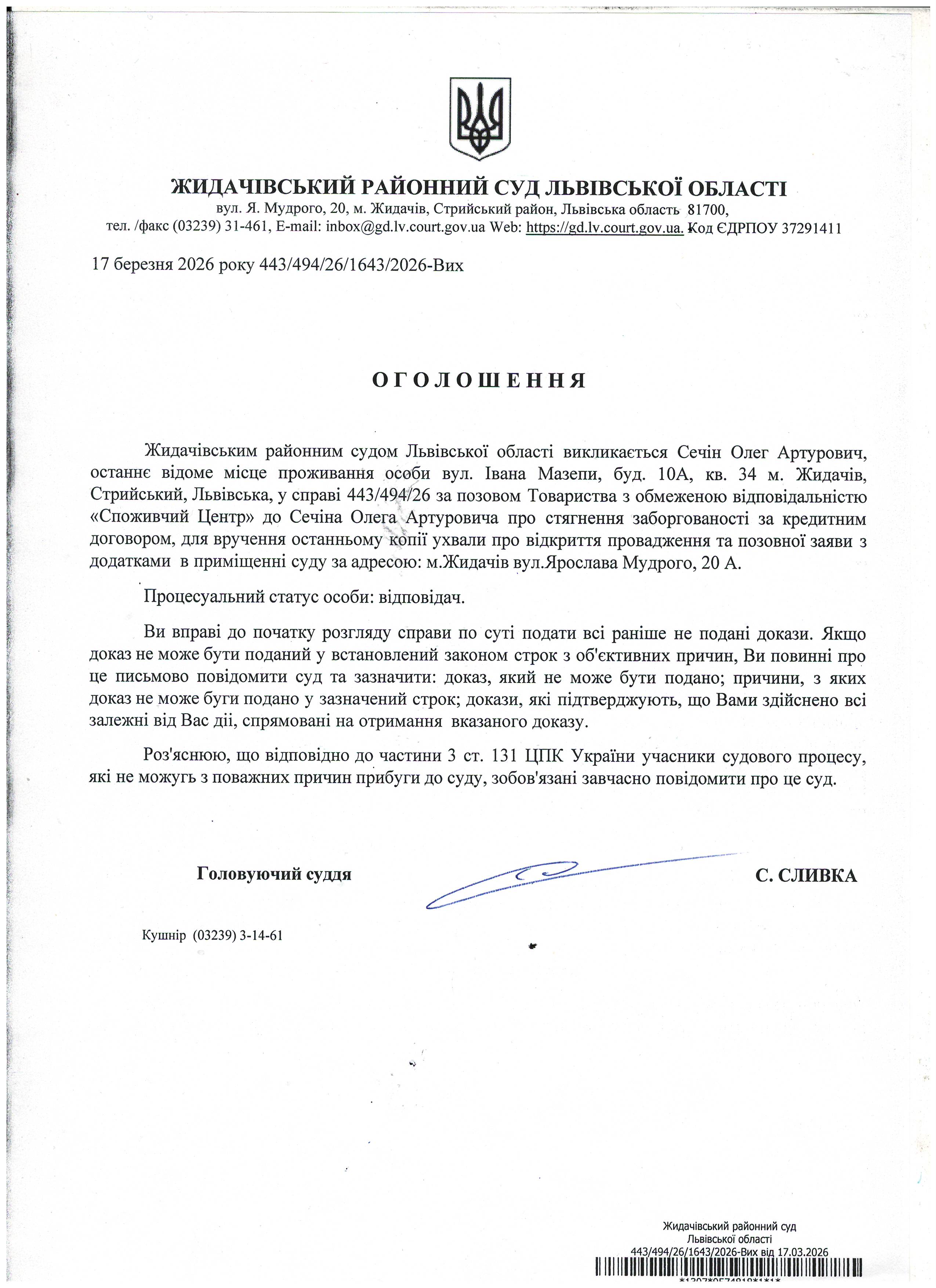 Оголошення про виклик до суду Сечін О.А.