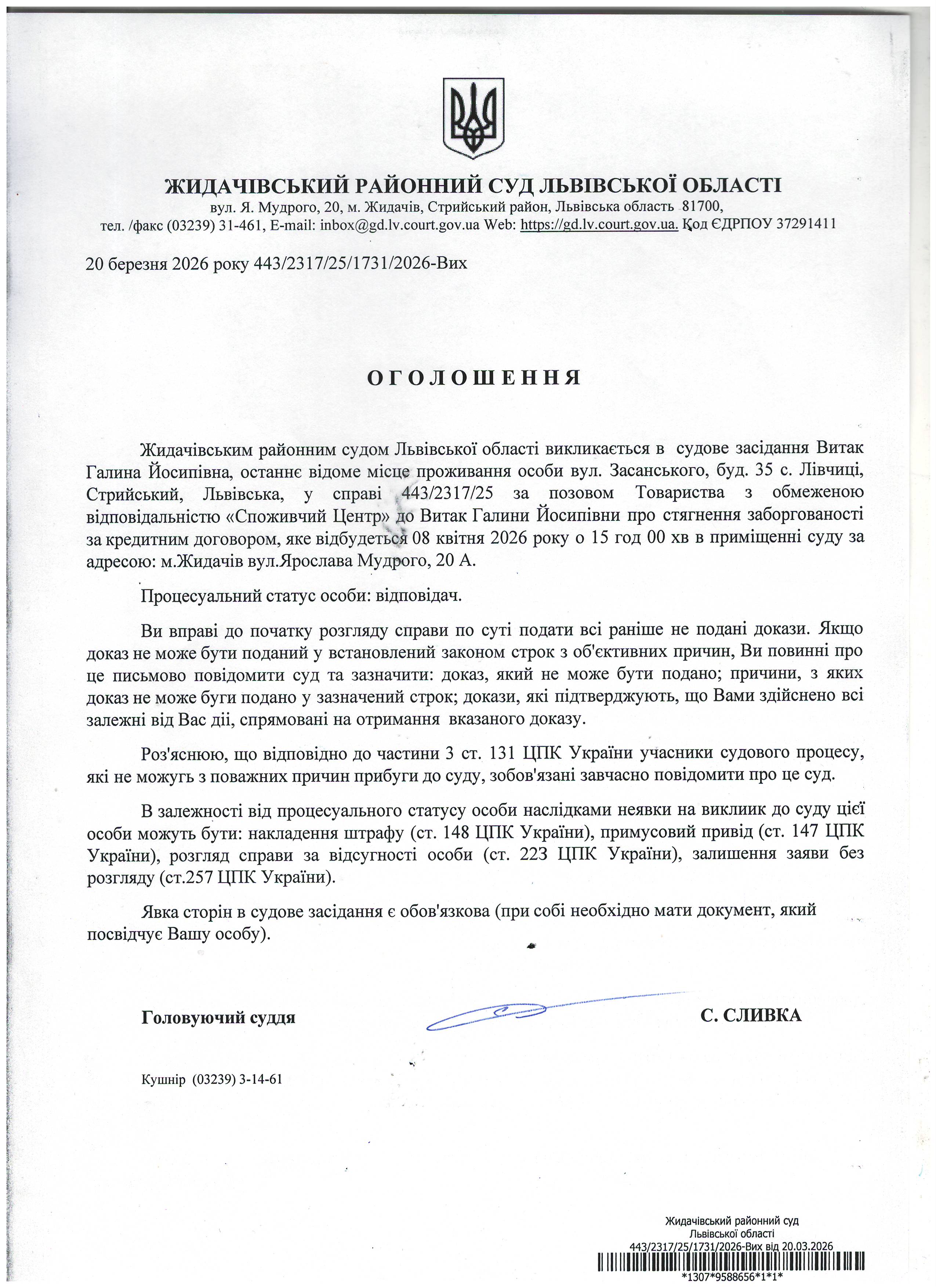 Оголошення про виклик до суду Витак Г.Й.