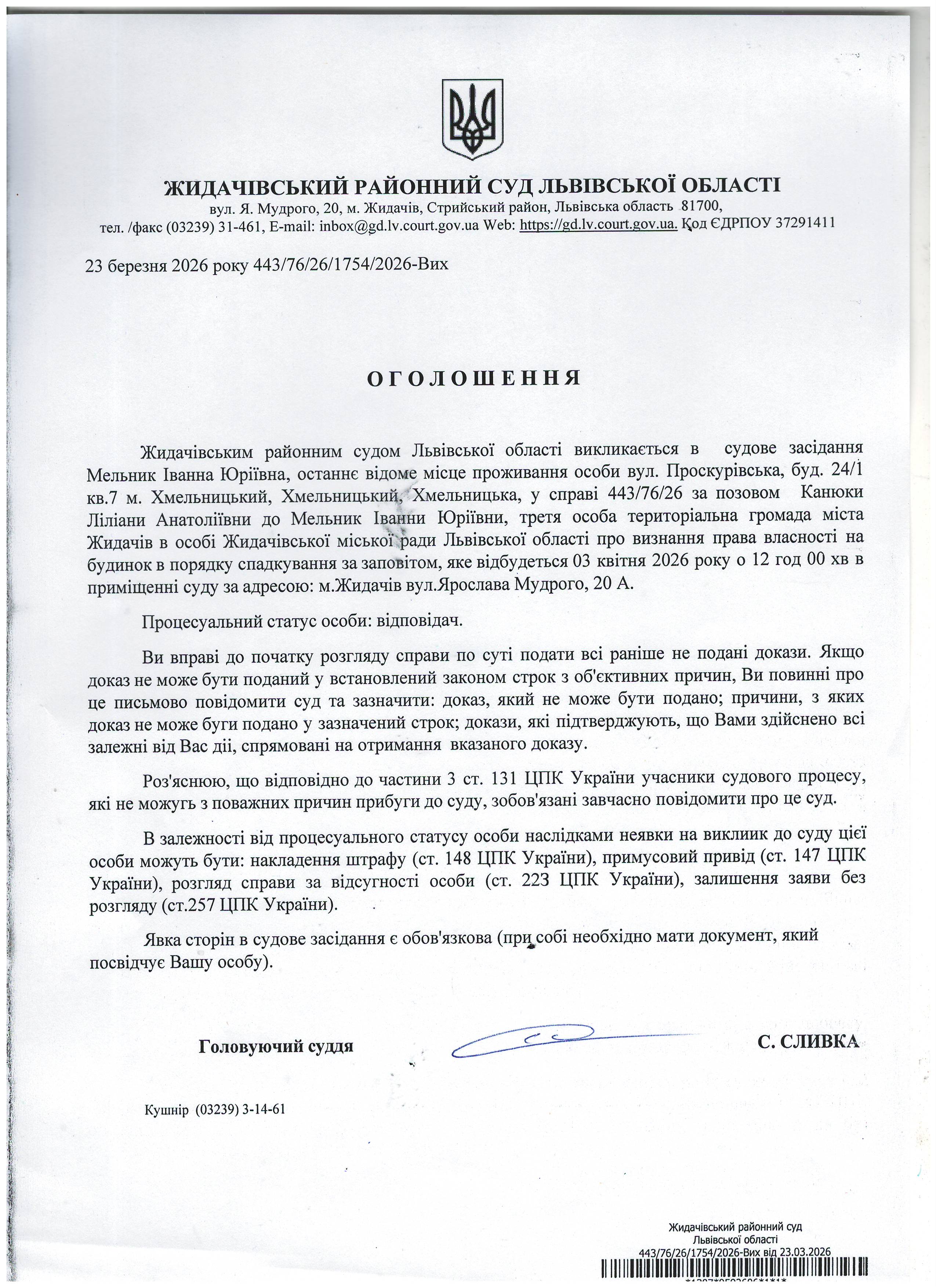 Оголошення про виклик до суду Мельник І.Ю.
